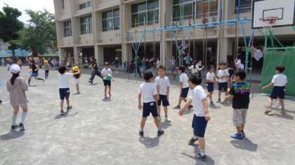 先生と一緒にバレーボールですね。バスケットボールも人気です。