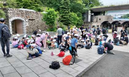 多摩動物公園に到着しました。クラス写真を撮り、トイレ休憩しています。