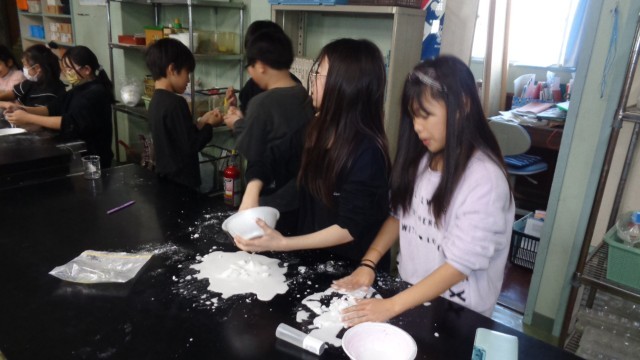 サイエンスクラブのようすです。片栗粉と水でできる「ダイラタンシー」を作っていまし...