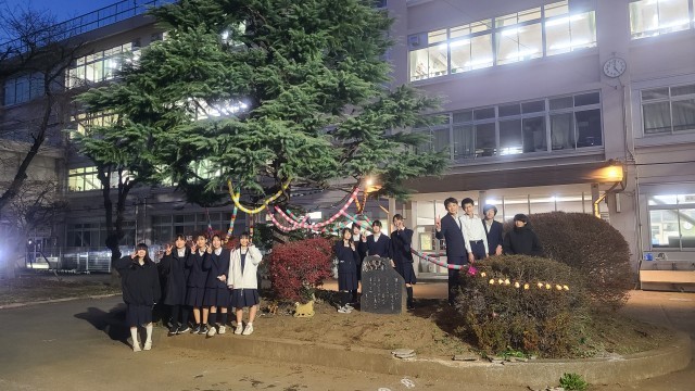 ボタンティア部が一中のシンボルツリーの装飾をしてくれました。東京では30年ぶりにクリスマスイヴの雨ですね。