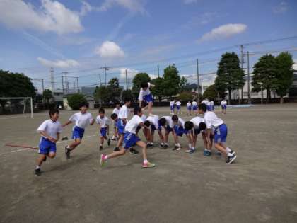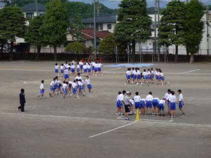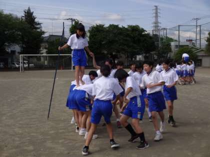 1年2・3組、体育。体育大会の学年種目、いかだ流しの練習です。ガンバレ!