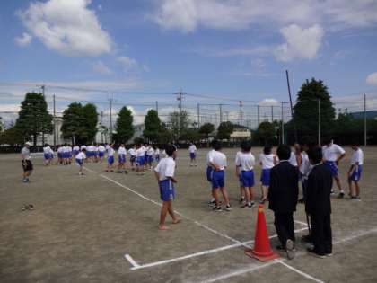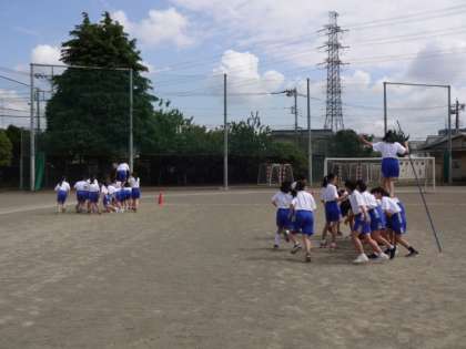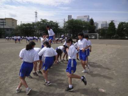 1年2・3組、体育。体育大会の学年種目、いかだ流しの練習です。ガンバレ!