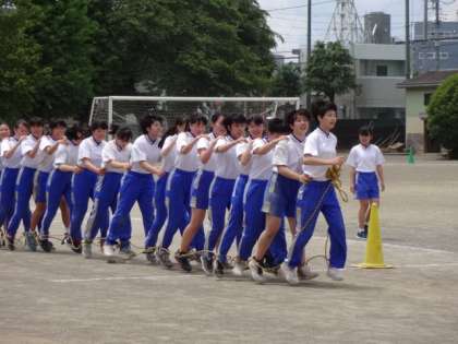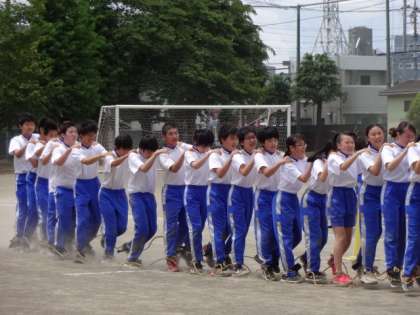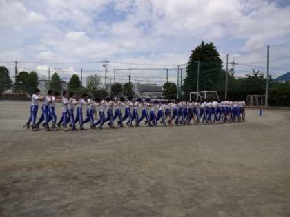 3年1・2組、体育。体育大会の学年種目、大ムカデの練習です。ガンバレ!