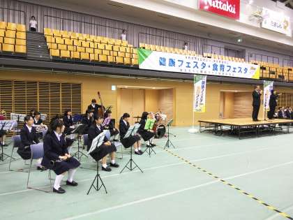 今日、健康フェスタ食育フェスタがエスフォルタアリーナで行われました。開会式では吹奏楽部が演奏しました。