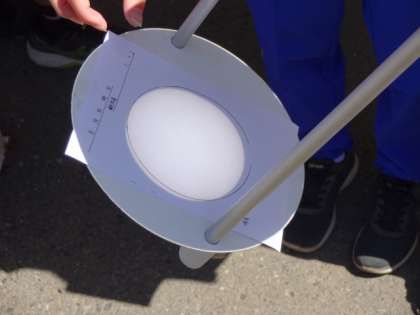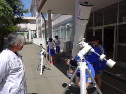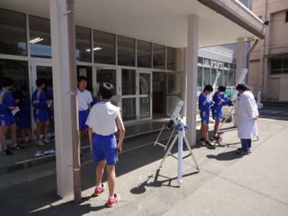 3年4組、理科。太陽の黒点を調べる。望遠鏡に太陽投影板を取り付けて観測です。
