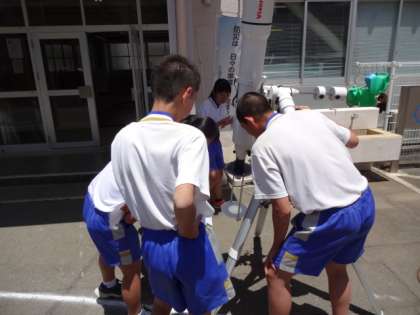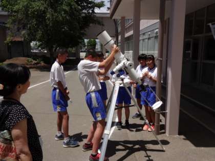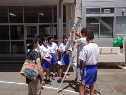 3年3組、理科。太陽の黒点観察。「どう動かすんだっけ?」学校運営協議会の会長さんも興味津津。
