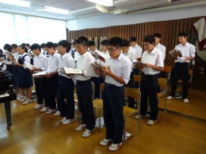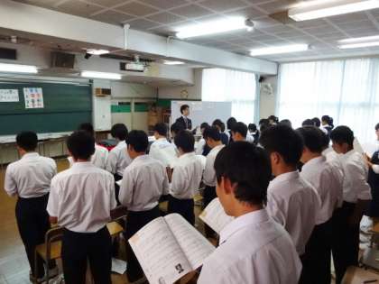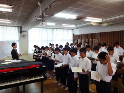 3年4組、音楽。教育実習の先生が「花の街」の授業中でした。