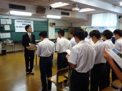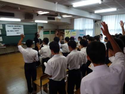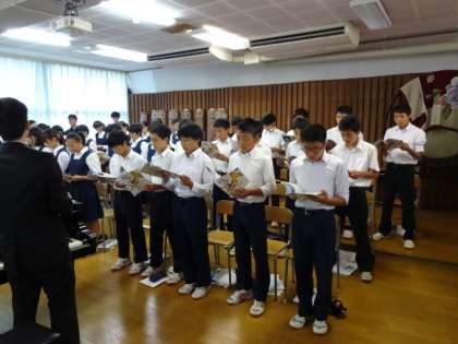 3年4組、教育実習の先生の研究授業です。大学の先生もいらっしゃっています。「荒城の月」を学んでいます。