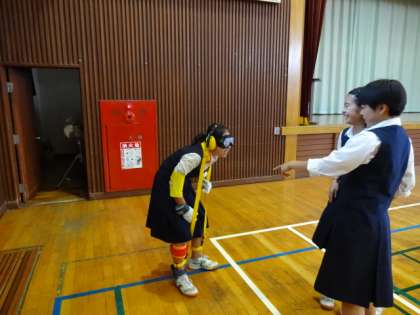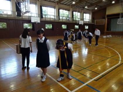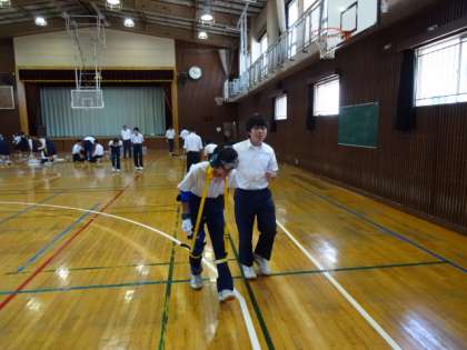二人一組で階段を上ったり下りたりします。疑似体験です。