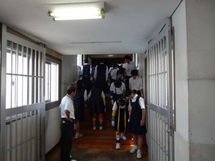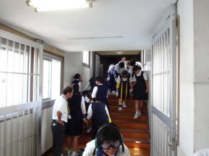 二人一組で階段を上ったり下りたりします。疑似体験です。手足が思うように動かない、見える範囲が狭い、耳がよく聞こえないという高齢者の大変さがよく分かったという感想でした。