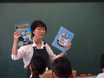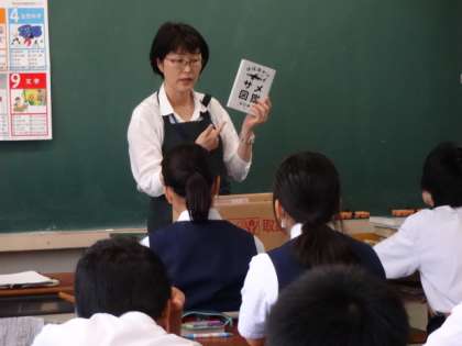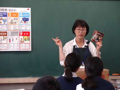 2年4組、ブックトーク。日本十進分類表に従って、司書の方がおすすめの本を紹介してくださいました。