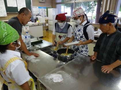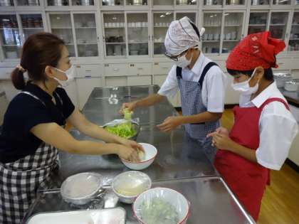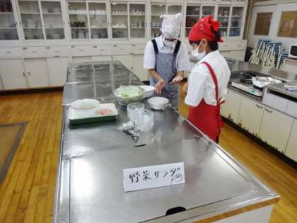 7組が調理実習を行っていました。献立は「カレーライス」「野菜サラダ」「プリン」です。