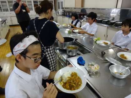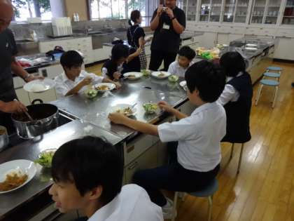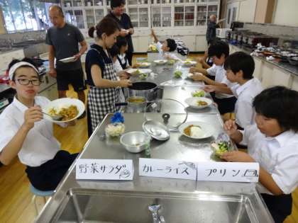 7組が調理実習を行っていました。献立は「カレーライス」「野菜サラダ」「プリン」です。試食です。