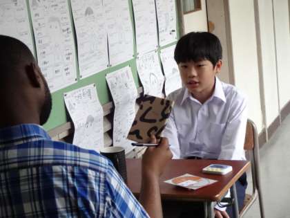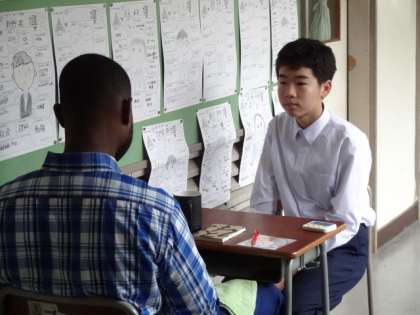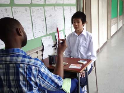 1年5組、英語。ALTユージン先生のスピーキングテストです。緊張!