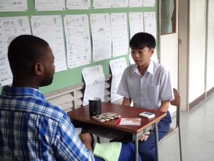 1年5組、英語。ALTユージン先生のスピーキングテストです。緊張!