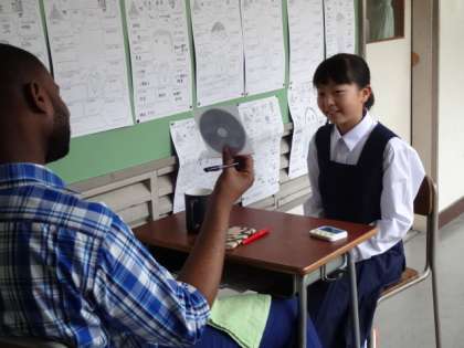 1年5組、英語。ALTユージン先生のスピーキングテストです。緊張!