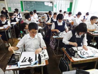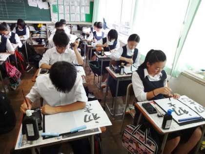 2年2組、国語。毛筆の練習です。「初志」