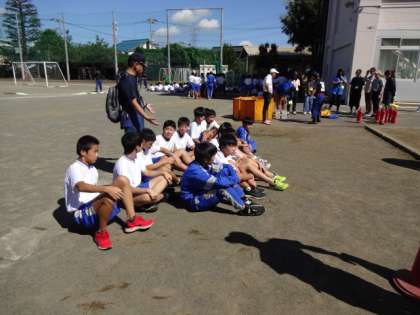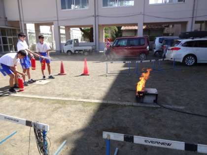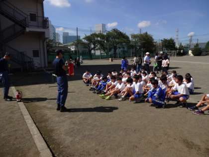 2年生。放水訓練、初期消火訓練、バケツリレー、簡易トイレ設置訓練を学びました。