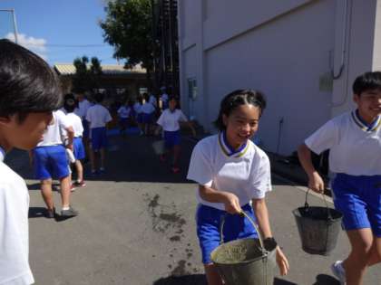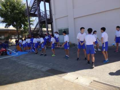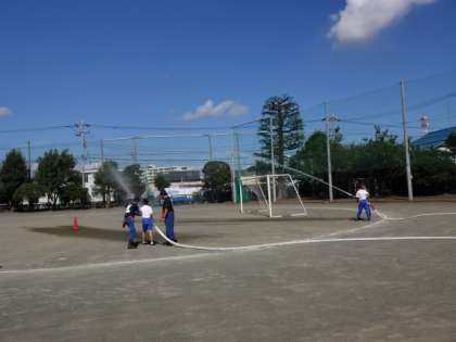2年生。放水訓練、初期消火訓練、バケツリレー、簡易トイレ設置訓練を学びました。