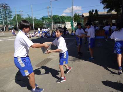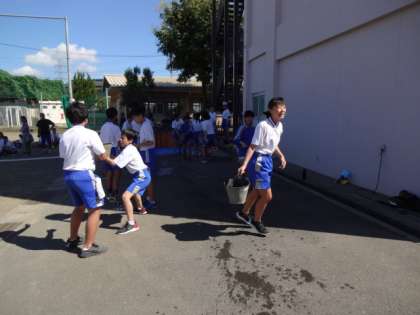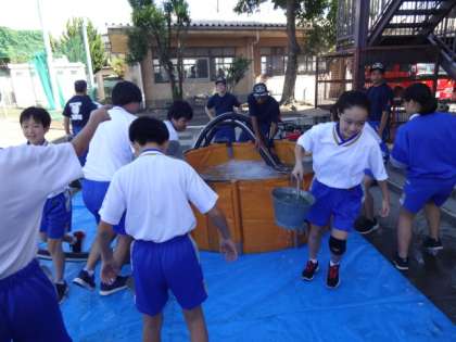 2年生。放水訓練、初期消火訓練、バケツリレー、簡易トイレ設置訓練を学びました。