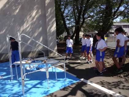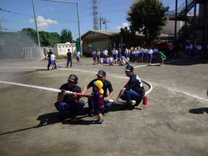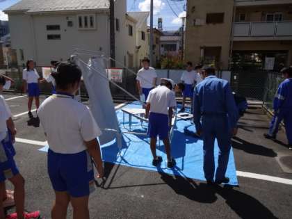 2年生。放水訓練、初期消火訓練、バケツリレー、簡易トイレ設置訓練を学びました。