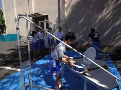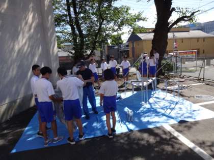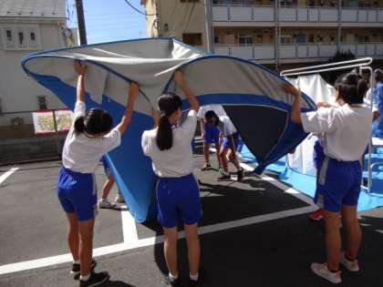 2年生。放水訓練、初期消火訓練、バケツリレー、簡易トイレ設置訓練を学びました。