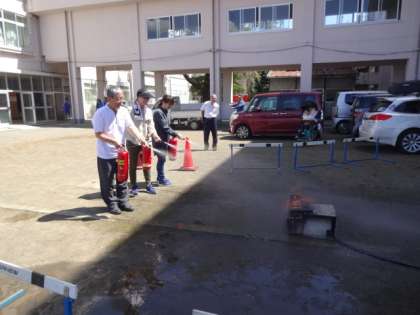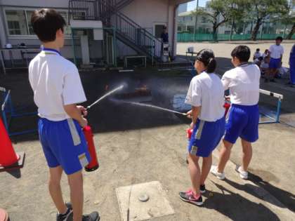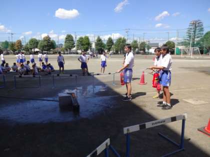 2年生。放水訓練、初期消火訓練、バケツリレー、簡易トイレ設置訓練を学びました。