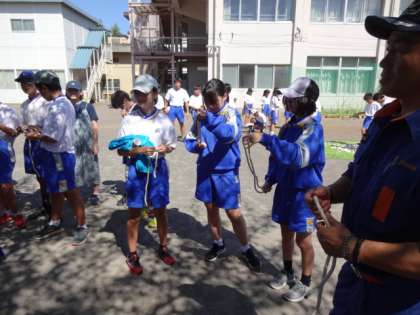 1年生。大型テント設置訓練、ロープワーク、煙体験・ガラス踏み(ペットボトルキャップ代用)体験を学びました。