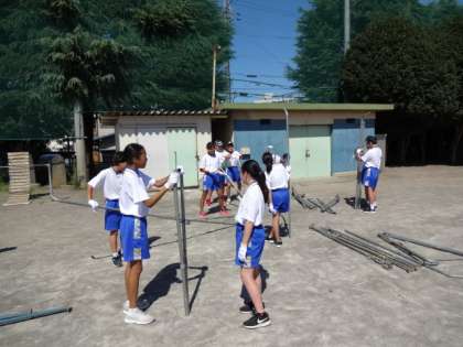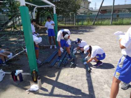 1年生。大型テント設置訓練、ロープワーク、煙体験・ガラス踏み(ペットボトルキャップ代用)体験を学びました。