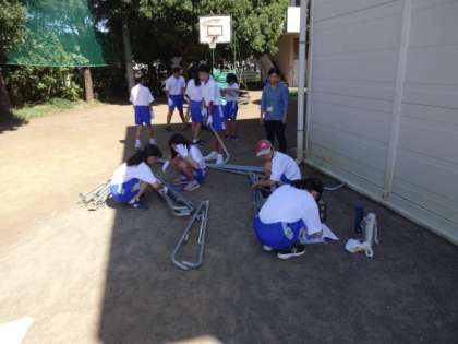 1年生。大型テント設置訓練、ロープワーク、煙体験・ガラス踏み(ペットボトルキャップ代用)体験を学びました。