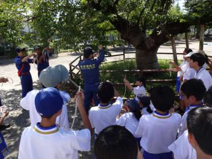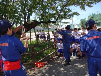 1年生。大型テント設置訓練、ロープワーク、煙体験・ガラス踏み(ペットボトルキャップ代用)体験を学びました。