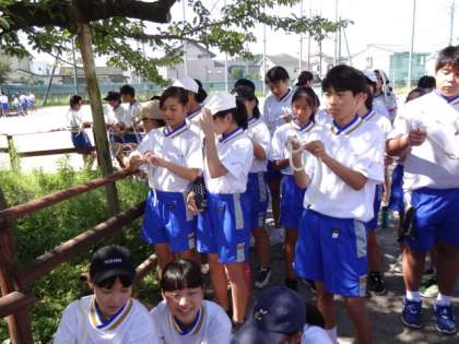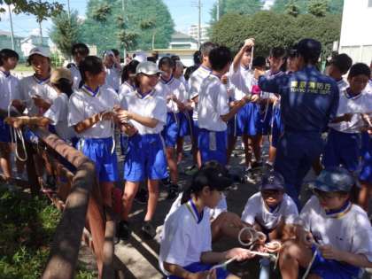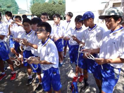 1年生。大型テント設置訓練、ロープワーク、煙体験・ガラス踏み(ペットボトルキャップ代用)体験を学びました。