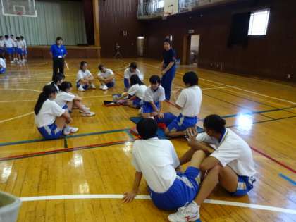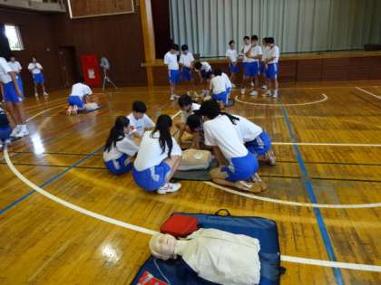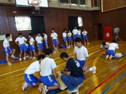 3年生。心肺蘇生法・AED操作法、止血法・担架搬送法を学びました。