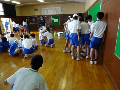 3年生。心肺蘇生法・AED操作法、止血法・担架搬送法を学びました。