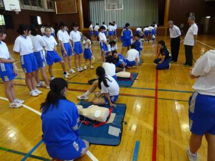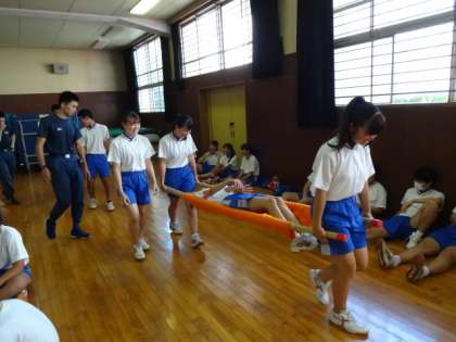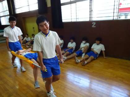3年生。心肺蘇生法・AED操作法、止血法・担架搬送法を学びました。