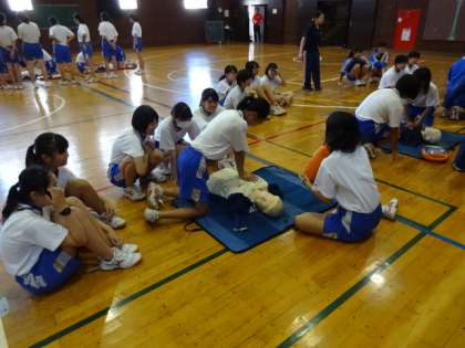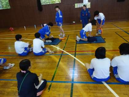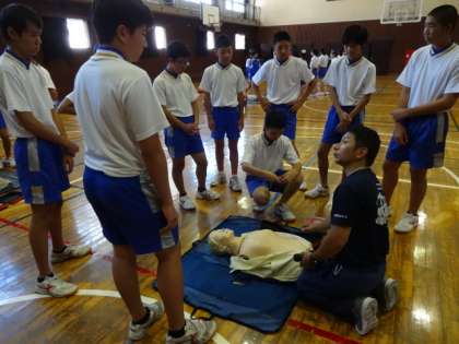 3年生。心肺蘇生法・AED操作法、止血法・担架搬送法を学びました。