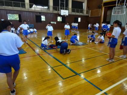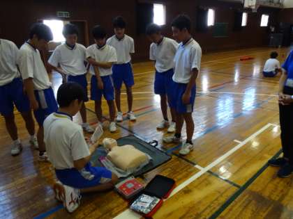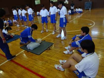 3年生。心肺蘇生法・AED操作法、止血法・担架搬送法を学びました。