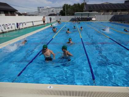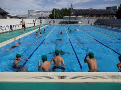 2年1・2組、体育男子。水泳です。今日は台風一過。暑いです。