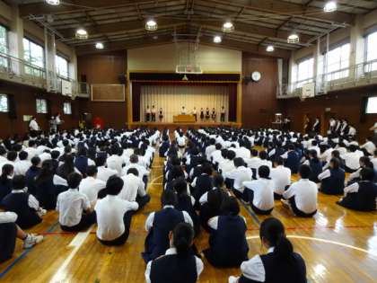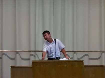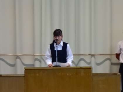 今朝は生徒会朝礼です。生徒会長が1年間の生徒会本部の活動の反省と、専門委員長が前期専門委員会の反省と改善点を述べました。