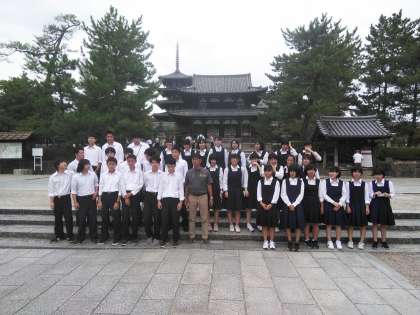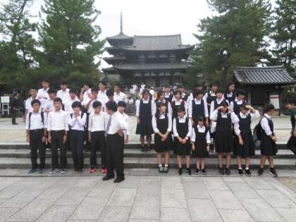 法隆寺でクラス写真です。