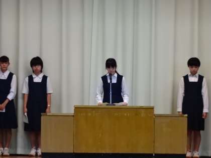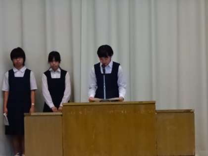 後期最初の生徒会朝礼です。新専門委員長が活動の目標を話しています。