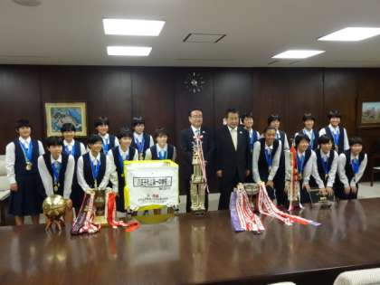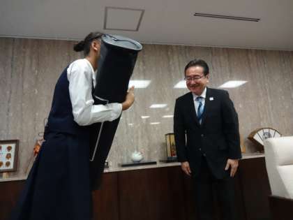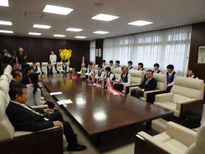 昨日、石森八王子市長へ全国大会優勝の報告のために、女子バスケットボール部の3年生が、表敬訪問を行いました。お祝いに「祝 連覇」の文字が入ったボールかごをいただきました。ありがとうございました。