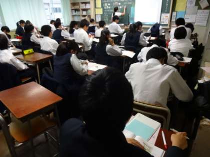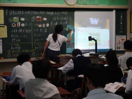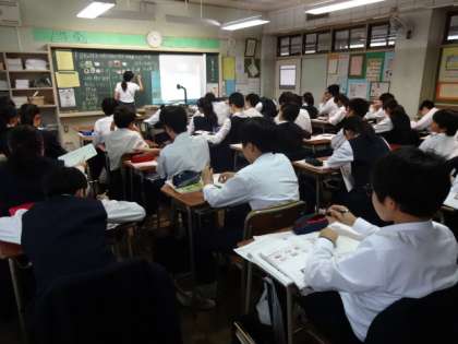 2年1組、家庭科です。授業変更で合唱の練習は3時間目に終わっていました。