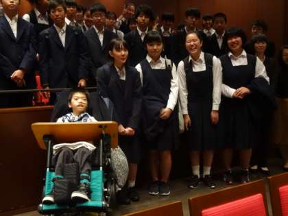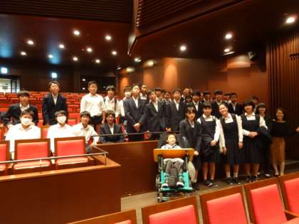 副籍交流で、八王子東特別支援学校の今井君が来てくれました。副籍クラスの2年2組の生徒たちと一緒に写真撮影です。