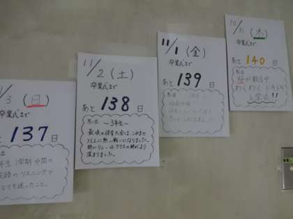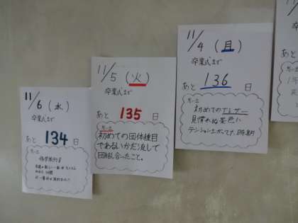 卒業式まであと○日カレンダーが、2階から3階に上がる階段の壁に貼ってあります。因みに今日はあと134日だそうです。