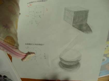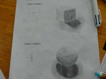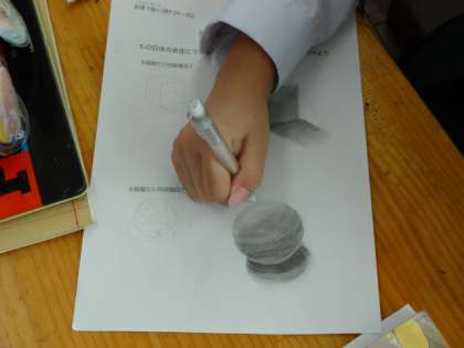 1年2組、美術。陰影のつけ方練習。6段階のグラデーションを使って、立体感を表そう!