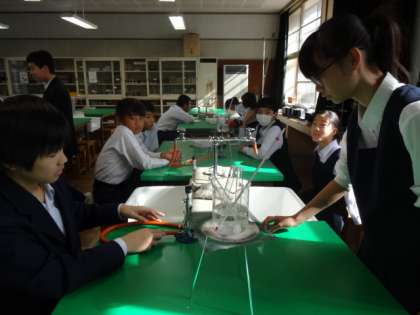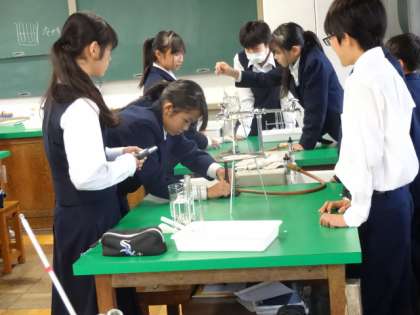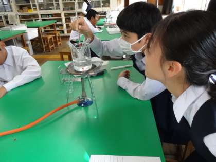 1年5組、理科。水にとけた物質のとり出し。塩化ナトリウム・硝酸カリウム、ミョウバンを使って実験です。