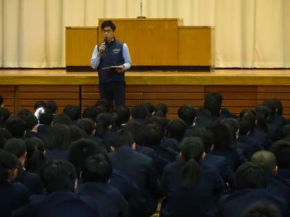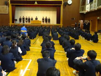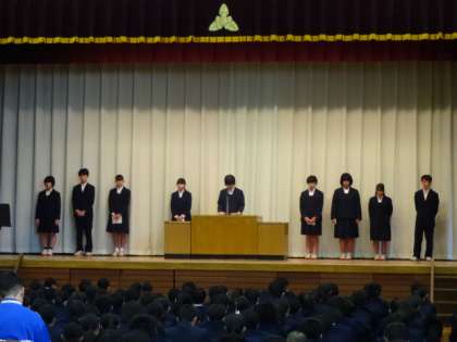 生徒会長と専門委員長が、今後の活動やノーチャイムプロジェクトへの取り組みについて話をしました。最後に深田先生から、冬服に関する注意がありました。