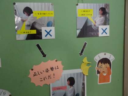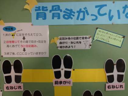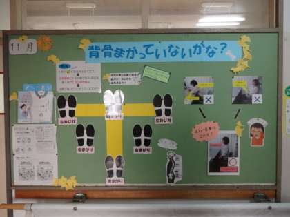 11月の保健室前掲示です。背骨まがっていないかな?正しい姿勢は?