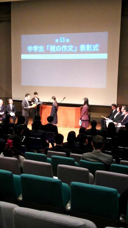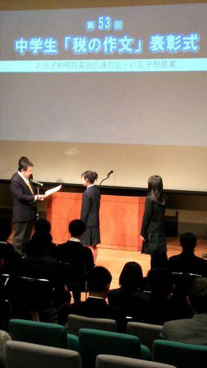 昨日行われた中学生「税の作文」表彰式の様子です。3名の3年生が受賞しました。おめでとうございます。